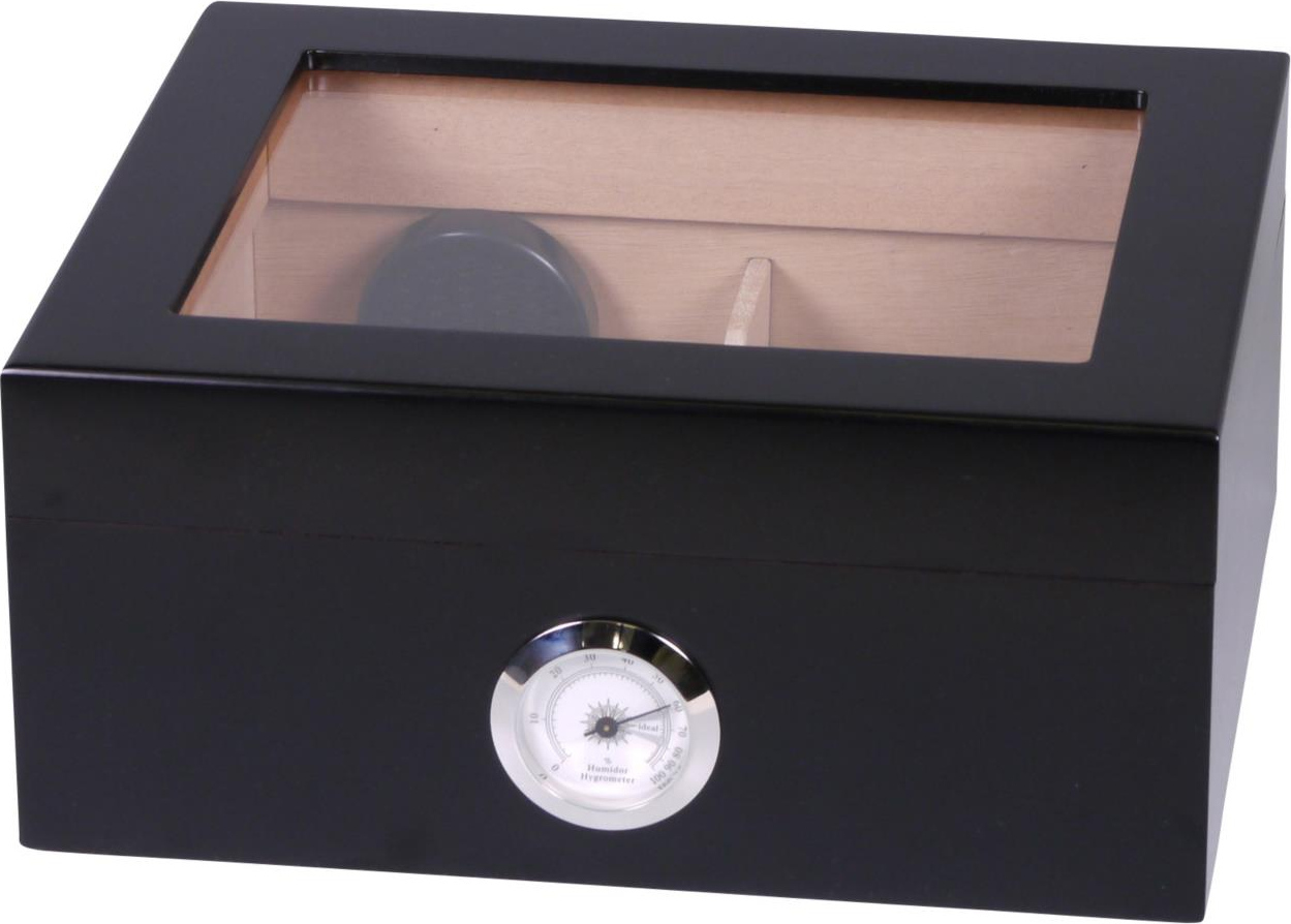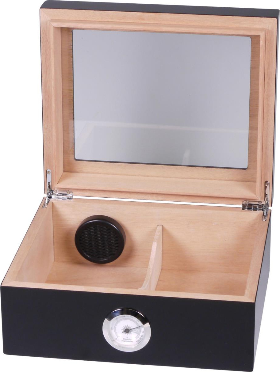 Стеклянная вставка в крышке позволяет вам всегда следить за своей коллекцией сигар; подвижная разделительная полоса помогает сортировать их по своему усмотрению. Интерьер просторного хьюмидора обшит высококачественной кедровой древесиной, которая вместе с увлажнителем поддерживает стабильную влажность воздуха. Серебряный гигрометр идеально дополняет современный дизайн в матовом цвете.