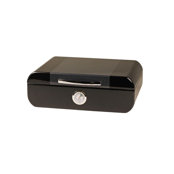 Благородный карбоновый хьюмидор насыщенного черного цвета, в котором можно разместить до 25 сигар.