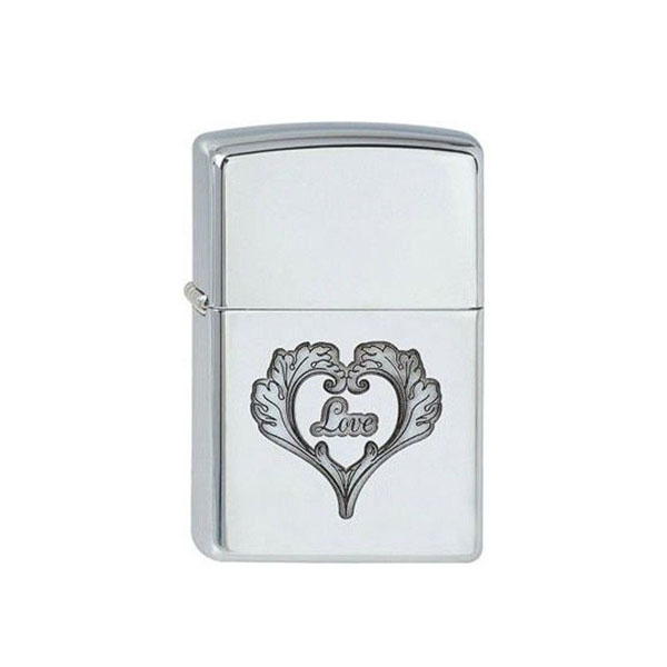 100% original SUA. Brichetă Zippo argintie, pe partea din față a modelului sub formă de inimă cu inscripția, Dragoste. Bricheta se vinde neumplută.