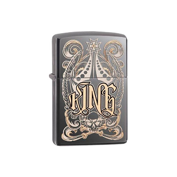 Bricheta Zippo Classic va fi pe placul persoanei extraordinare și strălucitoare. Corpul de alamă are un finisaj unic lucios Black Ice care schimbă nuanța de la gri la negru, în funcție de gradul de iluminare și unghiul de vizualizare. Partea frontală este decorată cu o inscripție mare King și model de design.